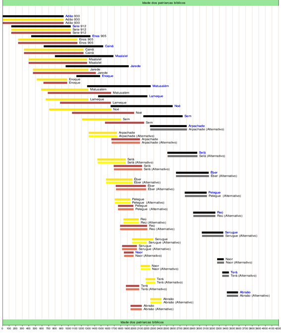 Adão viveu 930 anos depois do pecado e morreu. Sete, seu filho, viveu 912 anos; Enos, 905; Cainã, 910; Maalalel viveu 895; Jarede 962 e Enoque 365 anos. Matusalém viveu 969 anos, foi o que mais viveu; Lameque 777; e Noé, 950, e nesse ínterim, aconteceu o dilúvio. Após esse drástico acontecimento, a expectativa de vida começou a decair. Sem, 600 anos; Arfaxade, 438; Selá 433; Éber, 464; Pelegue 239; Reú, 239 anos também. Serugue, 230 anos; Naor, 148, Terá, 205 e Abraão, 175 anos.